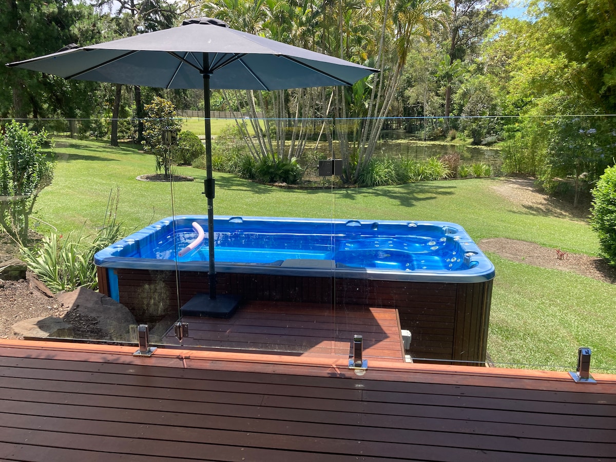 Creating space for you! Travelling with the family looking to unwind in the hot tub under the trees or relax by the crystal-clear waters of the heated lagoon pool. A place to snuggle up on the soft furnishings in the lounge or read a book on the patio listening to the birds. Visiting for business? "La Chaumiere" is a modern, cozy home with internet speeds of over 80 Mbps. A place where you can enjoy the peacefulness of nature and come back to relax after a day exploring the Moreton Bay Region.