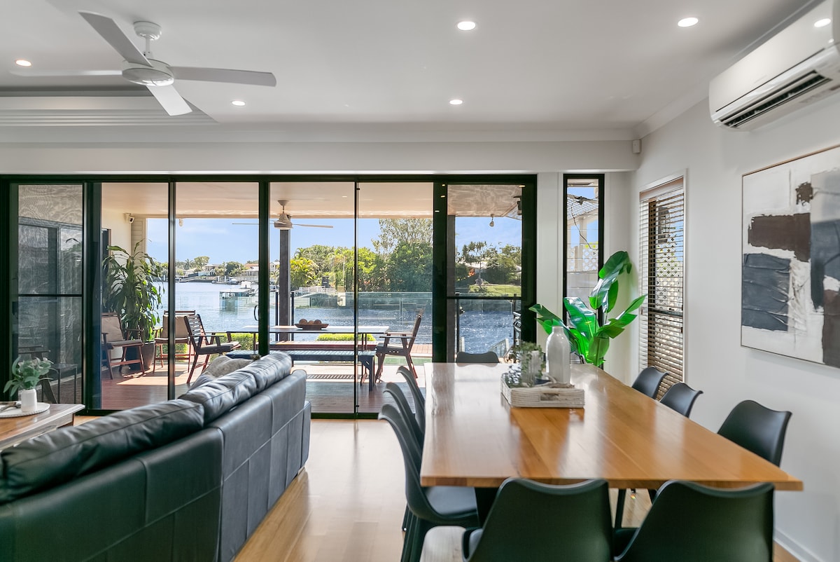 This holiday home offers a modern open plan living/dining, outdoor area for entertaining with views of the canal. A BBQ, plus a pontoon to moor your boat. This location is great for boaties, an easy access to Bribie Island passage via a canal lock which prohibits larger boats entry. Features: Master bedroom -queen bed with ensuite, 2nd bedroom one queen bed, third bedroom 2 single beds. The lounge room has a comfortable 3 piece lounge, smart TV, Wifi, aircon plus views of the canal.