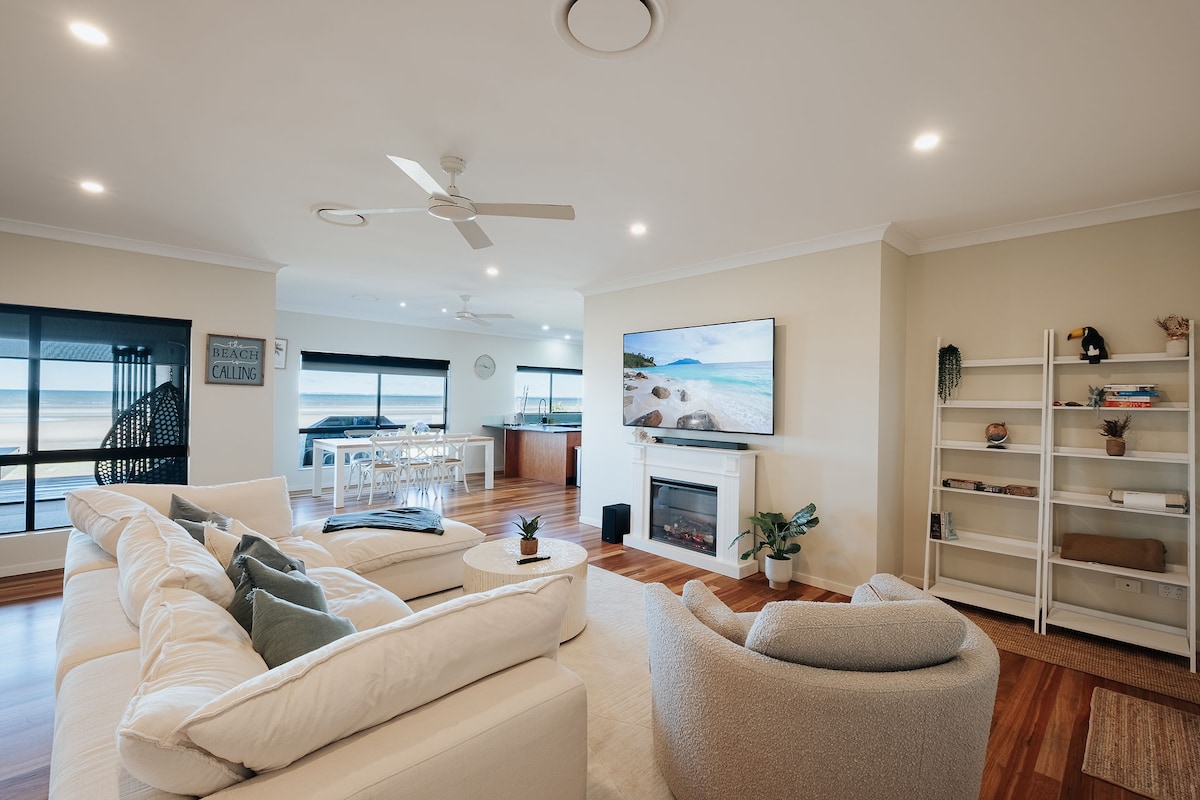 Enjoy stunning ocean views from this huge 4 bedroom unit, perfectly set up to sleep up to 8 guests. With generous open-plan living areas & separate lounge,there’s ample space for 2 families.Enjoy direct access to a boat ramp,beaches, parks & bike path with no roads to cross. Freshly updated with new paint, floors & furnishings, it’s a relaxed base for a coastal stay. Air-con in the main living areas and 2 balconies with seating plus a BBQ make it ideal for laid-back days overlooking the water.