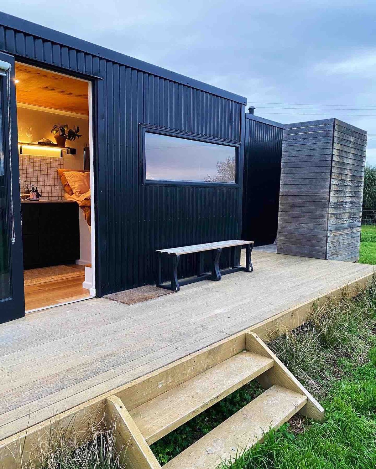 This tiny house, the Nook, is nestled under oak trees. A perfect stay during the local wedding season, or when you just want to get out and explore. Styled with a rustic touch and wabi-sabi principles, the Nook is equipped with a queen bed and kitchenette facilities, including a bbq, and even an outdoor bath! This amazing place is here to enjoy a stress-free environment - just sit, have a glass of wine, & relax while enjoying the rural vistas from the veranda.