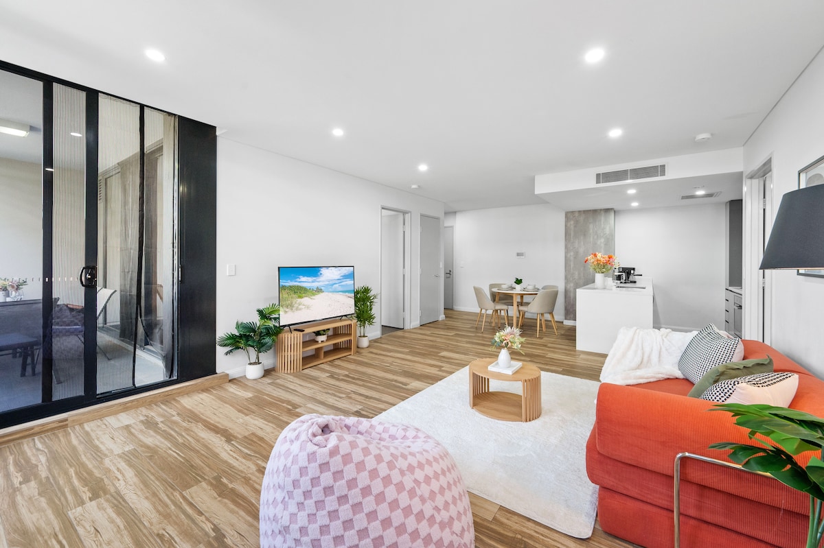 Top-floor apartment with spectacular views of the city skyline and Parramatta River. Thoughtfully styled with warm tones, brass finishes, and bathed in natural light. Ideal for business travellers, couples and digital nomads. ✨ Outdoor pool with sauna 🛏 Queen + double bed ☕ Walk to Harris Park & Parramatta restaurants 🚉 Light rail at your doorstep