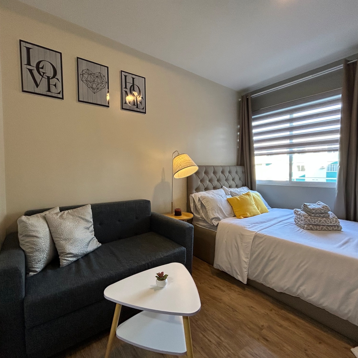 Welcome to a modern nordic design unit located at the roof deck w/ stunning view of mountains. This minimalist place is a perfect place to kick back, relax and enjoy a staycation like no other. Location is very accesible, the building is located along the road of Sta. Rosa - Tagaytay. If you decide to stay home, just lay down and turn on the TV all day long. You can also leave the windows open and sleep through the night with such cool breeze.