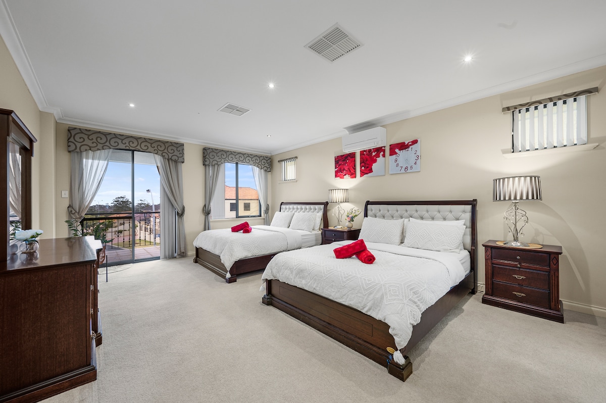 Luxury 4-bedroom villa sleeps 12 with 4 ensuite bathrooms, perfect for families or groups of friends. Enjoy city views, home theatre, trampoline, and modern living spaces. Minutes from the city, airport, beaches, and Swan Valley. Stylish, spacious, and full of fun — ideal for relaxing, entertaining, exploring, or celebrating. Comfort, adventure, and unforgettable memories all in one amazing home!