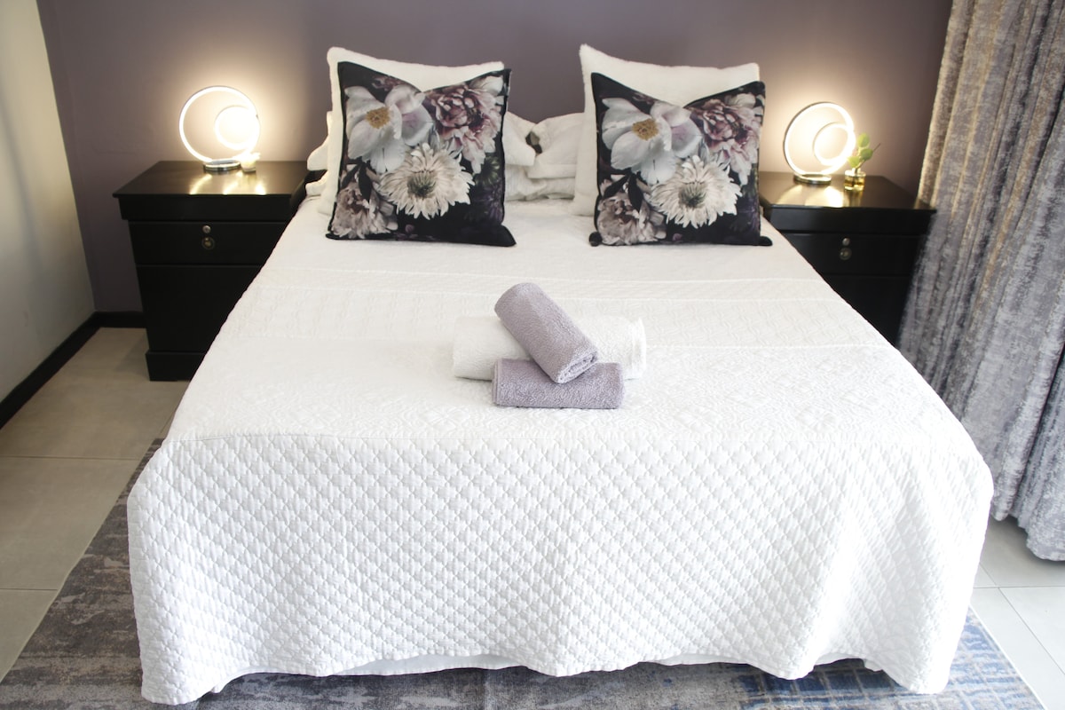 Charming farm house decor in whites and greens. Revamped modern bathroom with shower. Queen size bed plus three quarter bed for extra guest/children. Private garden patio area with table and chairs. Breakfast on request from 7 to 9am. Fiber wifi. Small well trained dogs with their own beds welcome. There is ample parking, security and a swimming pool available. The room is serviced weekly or at your convenience.