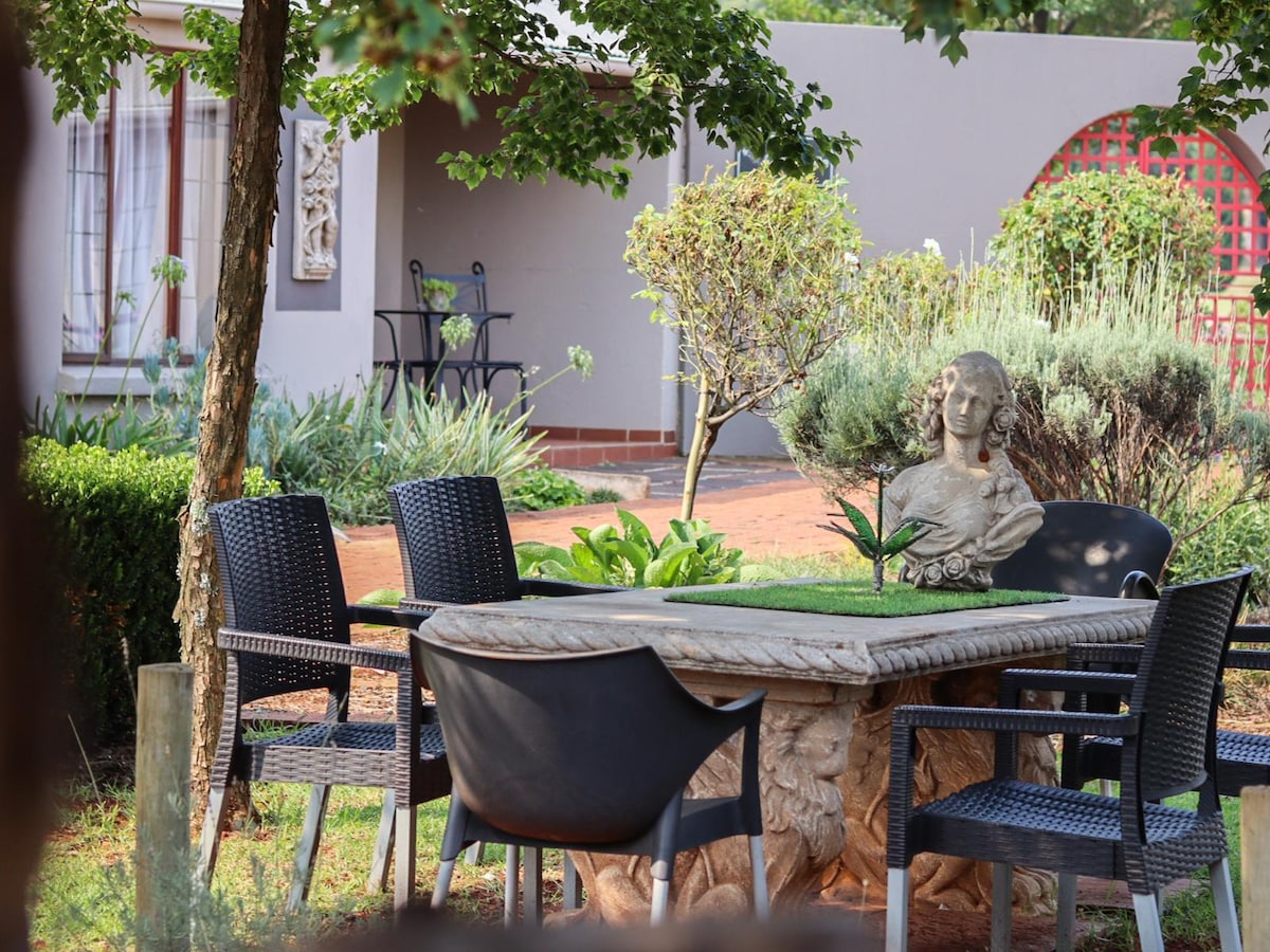 Welcome to your peaceful escape! This rustic and cozy rondo offers the perfect blend of comfort, privacy, and convenience. Whether you're a business traveler, couple, or family, you'll enjoy a relaxing stay. Features Spacious 2-bedroom unit with premium bedding Modern bathroom with fresh towels & toiletries Fully equipped kitchen Fast Wi-Fi & dedicated workspace for remote work Outdoor seating area Secure gated parking on-site Smoking in shared areas. 10 minutes to OR Tambo Airport.