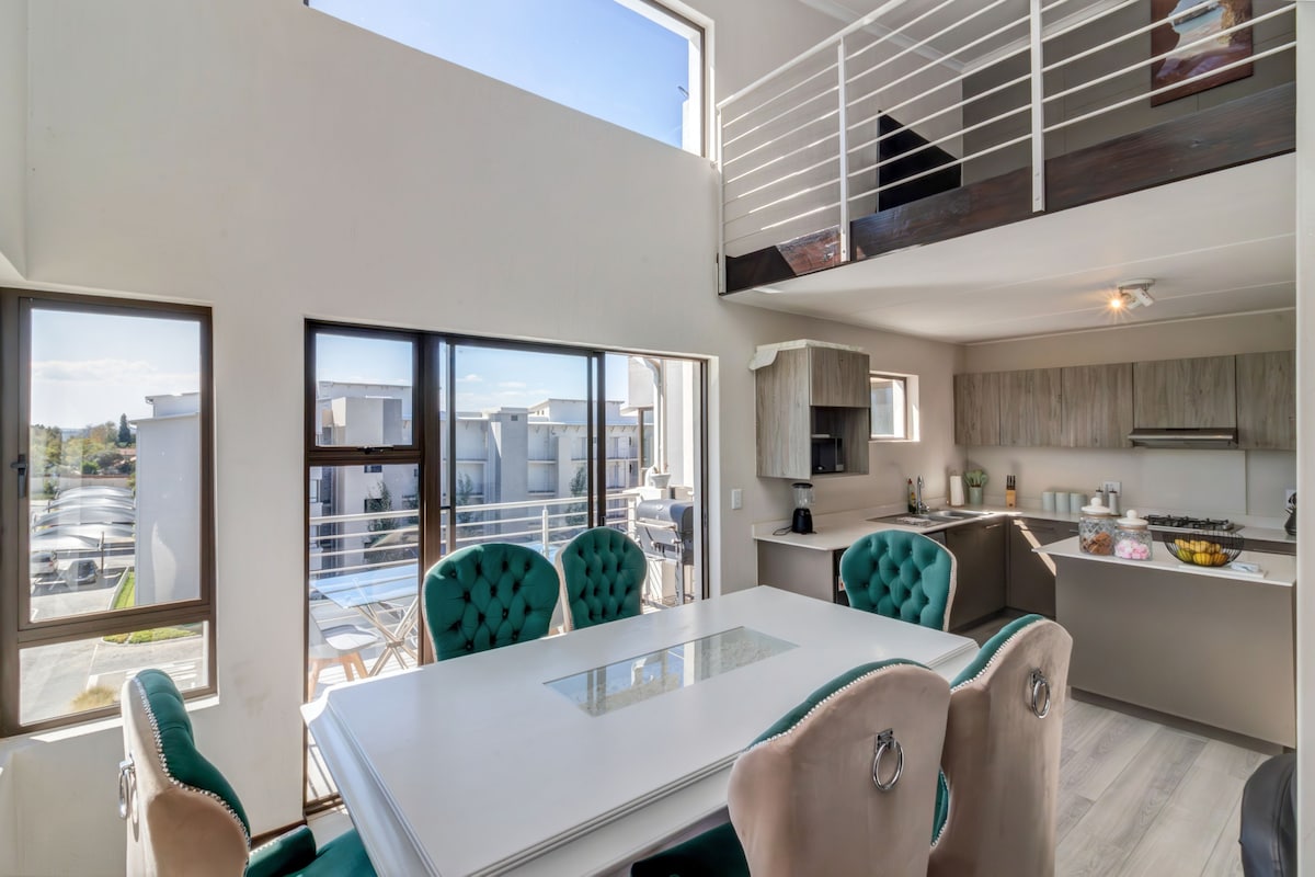 A light and spacious loft apartment with 2 TV's, Netflix, uncapped Wifi and aircon/ heating. There is a backup power unit provided for the Lounge Television, Wifi, and your mobile devices. The upstairs covered entertainment area is the ideal place to relax and unwind with a gas braai, outdoor couches and retractable blinds. The apartment is fully equipped and has a washing machine with dryer. The estate features a swimming pool, events area and gatehouse security with patrolling guards 24/7.
