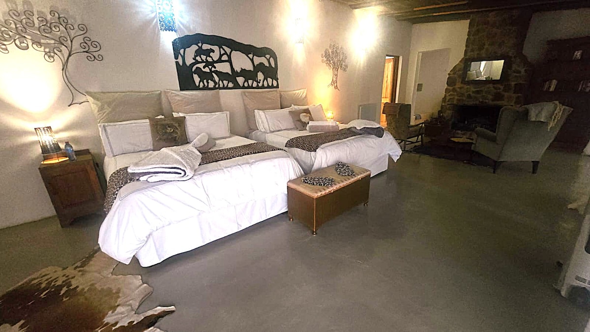 Bee Eater's Burrow! This unit includes 1 bedroom, 1 bathroom, and a cozy lounge with a fireplace. A fully equipped kitchen and space for 4 extra beds in the living area making it ideal for families or groups. Amenities at Motozi Lodge include: - Full Breakfast Included - Free WiFi - 3 Outdoor Swimming Pools - Dedicated braai areas - Breathtaking Mountain view from the Deck - Gardens and Ponds - A trampoline and Jungle Gym for Kids!