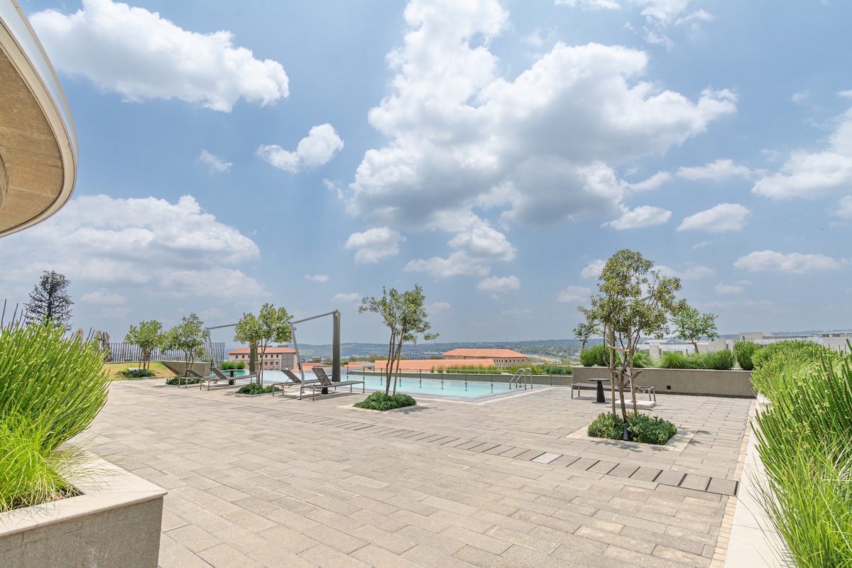 AirConditioned and Modern Luxury Living Steps to Mall of Africa: Full one-bed corner apartment with exquisite 90 degrees skyline for 2 guests. Uninterrupted Power, SUPER fast Uncapped WiFi, Queen-size bed, Work-Space and Fully kitchen. Sunrisers delight with breathtaking views of the sunrise and Night skyline Views. Netflix Apple TV DSTV Premium YouTube Premium Olives and Plates restaurant Life Day Spa Waterfall Equipped Gym Infinity Pool Free Secure Basement parking 24-hour security