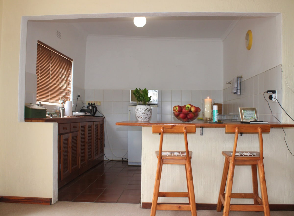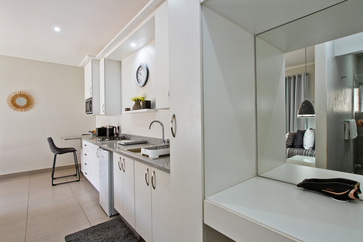 Self-catering Our studios are safe, elegant, and comfortable. Air-con, TV/Netflix, free Wi-Fi, kitchenette with amenities and secure parking. Centrally located in up-market Baileys Muckleneuk. For a romantic break or business trip. Relax after a long day with a cup of coffee in our serene garden under our decade old trees. Walking to Affies Sports Grounds 400m Loftus Versveld 1.2km Tuks 1.6km Boys High 1.4km Hospitals - Groenkloof, Zuid-Afrikaans and Jacaranda 2km UNISA 2.9km ID REQUIRED