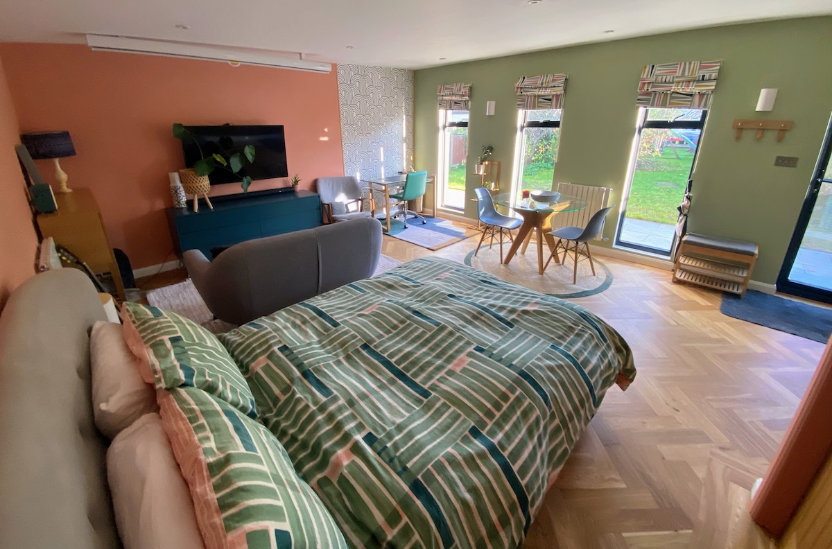 Welcome to the Hampton Court Hideaway, a peaceful and relaxing guesthouse (converted detached double garage), beautifully designed to a very high standard and powered by renewable energy. The property comes with a fully equipped kitchen, bathroom with walk in shower, 2 double beds (2nd on mezzanine) and one sofa bed upon request. We also have an EV car charger available on request. The space can fit up to 5 for shorter breaks, and comfortably 2-3 for longer breaks.
