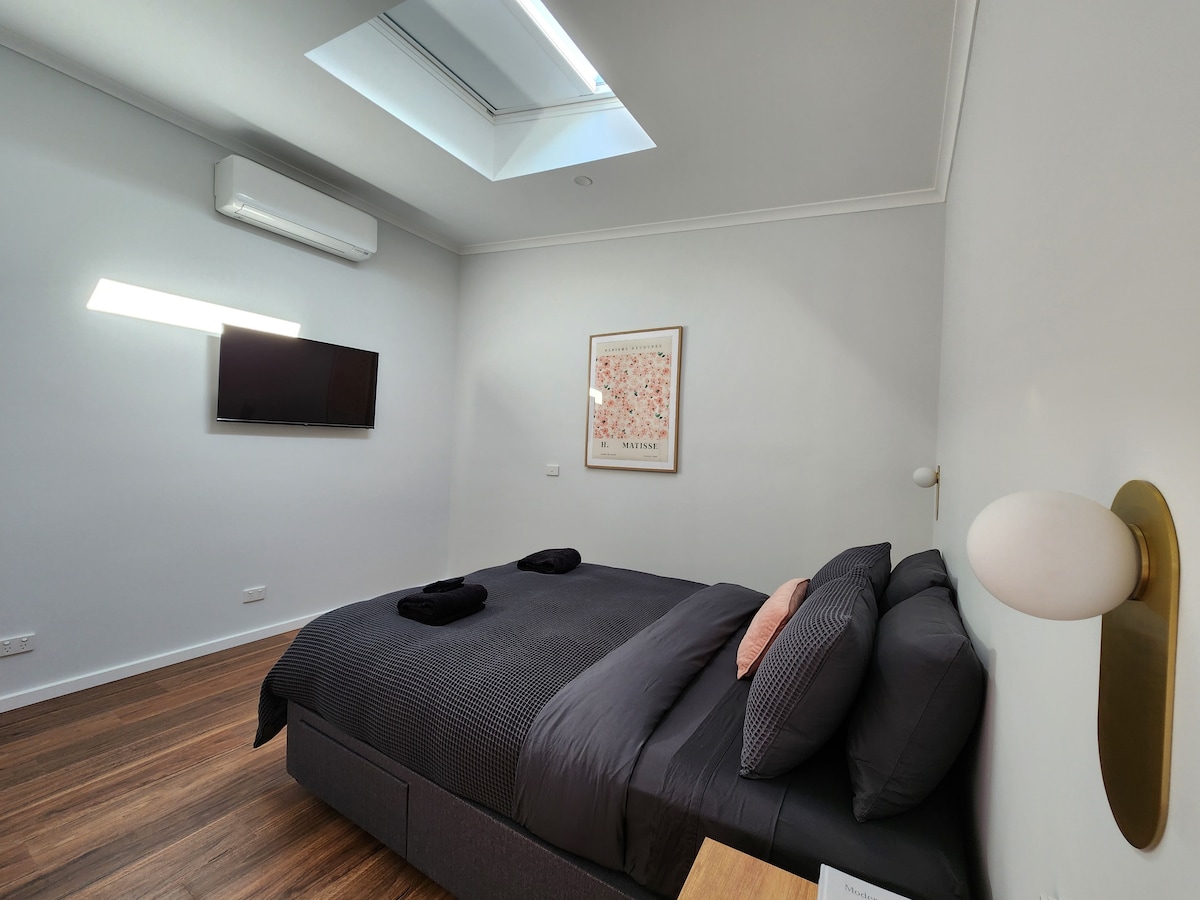 Our 2 bedroom apartment offers a quiet, contemporary space to retreat and relax in. With an enviable location, you're minutes to eateries & shops, Botanic Gardens & Murray River walking paths. The living space has views across Albury, and features a 70” smart TV. BR 1 has a king bed & 2nd TV & BR 2 a Queen bed. Both have premium mattresses made up with quality linen. Add secure parking, European kitchen, ducted heating/cooling throughout & your accommodation experience is complete.