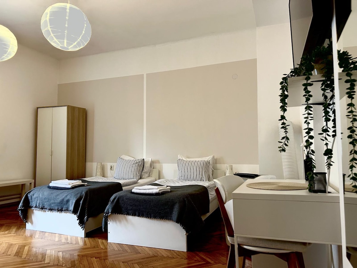 Experience Zagreb's heart from our stylish 2-bedroom apartment on Masarykova ulica. Tastefully decorated, it features a luxurious king-sized bed, two comfortable singles, and a versatile sofa bed for your group's perfect sleep setup. The apartment is located in a pedestrian zone, and the parking is available (and free) in a nearby garage, so your car is safe while you explore the pedestrian zone, historic landmarks, museums, and Zagreb's vibrant culinary scene.