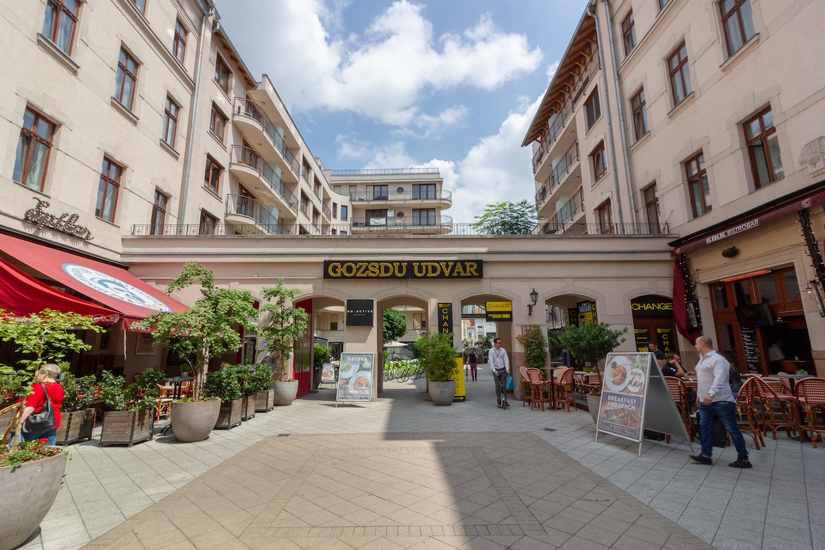 Rise to the top of a beautiful historic building and enter a bright and inviting space. It's fully upgraded and modernized, with glowing hardwood floors and richly textured bathroom tiles. Cheerful blue kitchen cabinets make cooking a delight. One of the hottest districts of Budapest, one of the most beautiful buildings, is a wonderful 40 sqm unique style apartment, all of which has been designed to make the traveller feel at home. Locked out of the noise of the city, yet when you exit the gate, you will be able to reach all important sights by a walk. Pets are also welcome! The neighbourhood is the most visited place in Budapest, due to its intimate atmosphere. Close to the Danube shore, Margitsziget, Parliament and only 3 tram stops from the famous party district. All public transports are just few minutes walk!