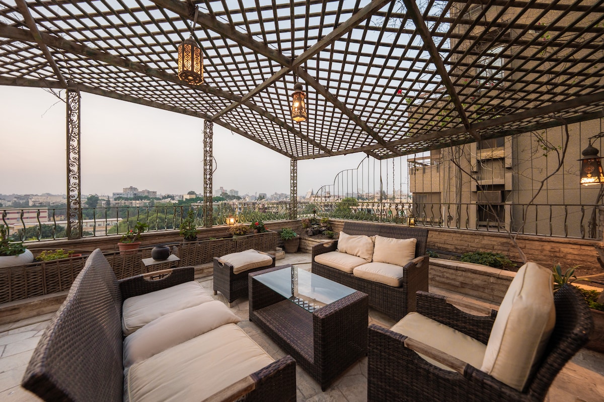 Welcome to Gardan in the Sky - Maadi, a Penthouse retreat with lush greenery and 270° skyline Views above cairo. Steps from Street 9 cafés, restaurants, and daily essentials. Enjoy central living with a private rooftop and terrace in one of Cairo's most walkable neighborhoods. The apartment features a bright living and dining area, fully equipped kitchen, Nespresso machine, 1.5 bathrooms, air conditioning, Wi-Fi, and a washing machine-ideal for both short and longer stays.