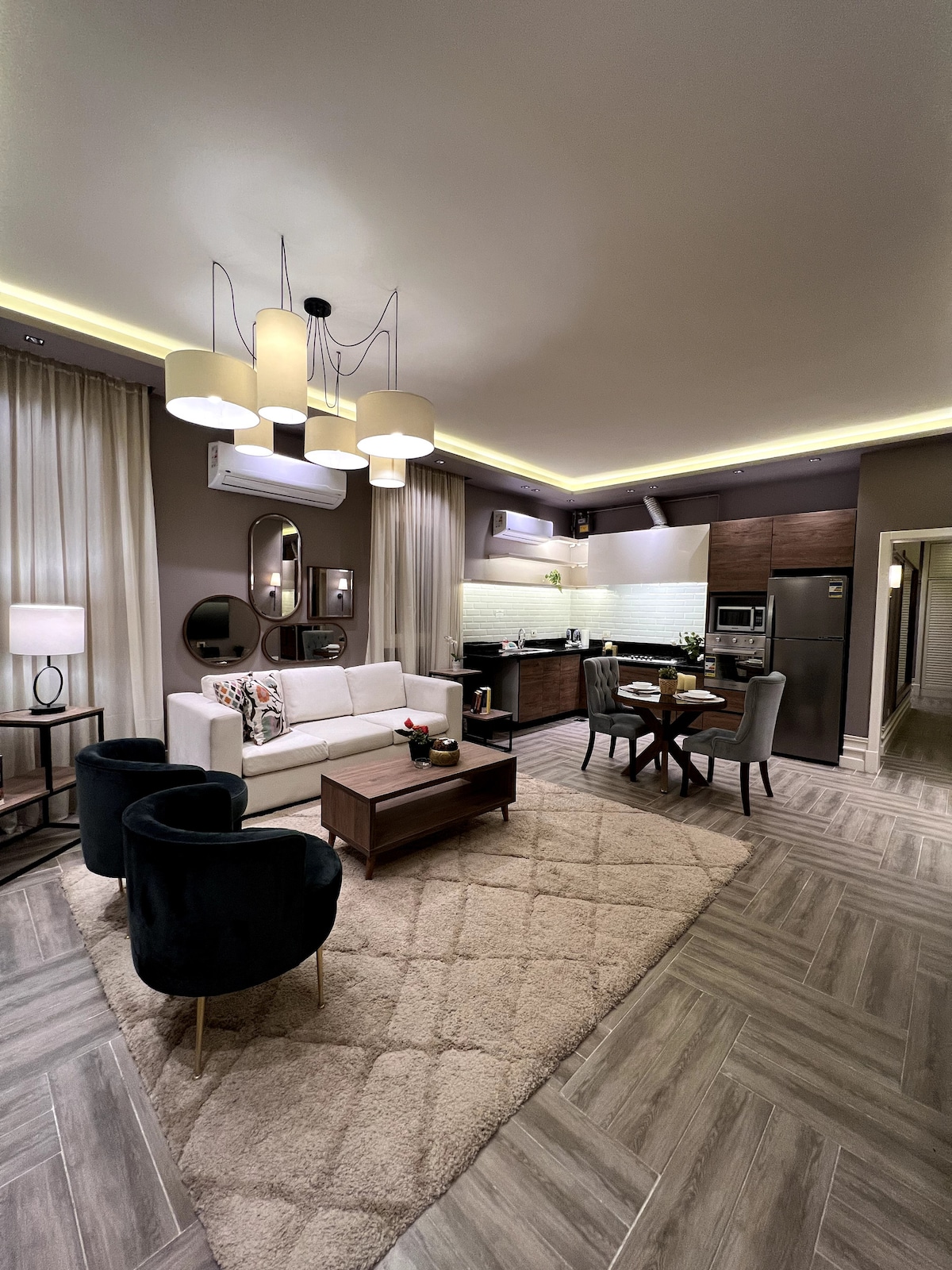Luxury studio with a modern design and a relaxing atmosphere, located in a quiet area in Nasr City near City Stars Mall. Features a private freestanding bathtub with hot water and shower, orthopedic mattresses for ultimate comfort, a fully equipped kitchen, and high-speed fiber Wi-Fi. Perfect for couples, solo travelers, and business guests looking for a clean, cozy, private, and peaceful stay close to the airport and main attractions.
