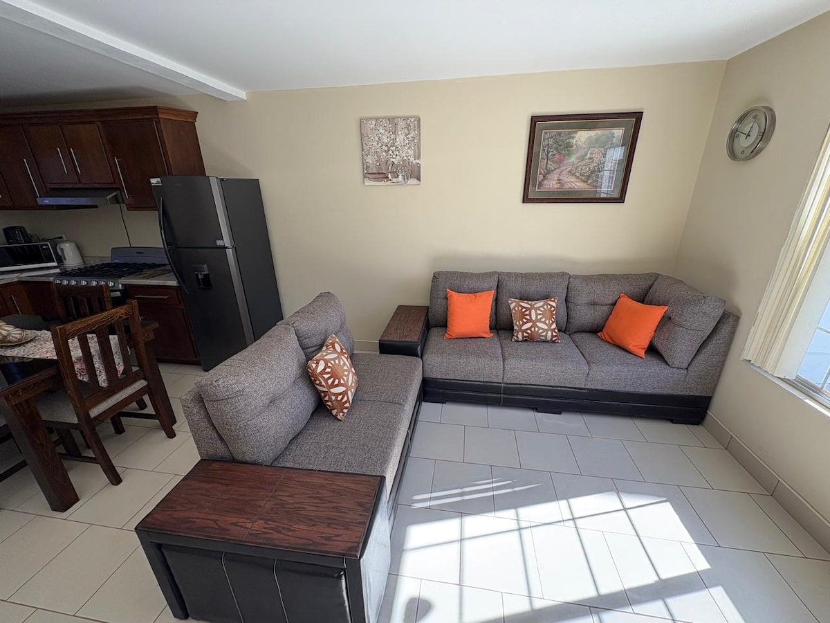 En este alojamiento podrás disfrutar de tranquilidad, comodidad y seguridad además de una excelente atención, tiene estacionamiento para dos vehículos, ubicada en una zona tranquila cerca de vialidades principales, muy térmica, cuenta con Minisplit frío/calor, tiene dos recamaras , cada una con cama matrimonial y un sofá cama ubicado en la sala, lugar ideal para tus vistas de negocios o placer, cuenta con accesorios en cocina para preparación de alimentos, para tu descanso cuenta con 3 TV.