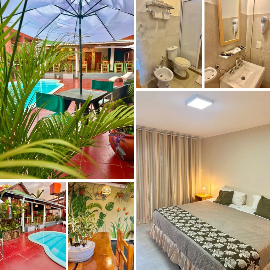 Es un alojamiento con buena vegetación en su interior, la mayoría de sus habitaciones cuentan con vistas a la piscina la cual esta habilitada todo el año. Esta ubicado a dos cuadras de la avenida principal donde tenes movilidad hacia donde quieras ir mediante buses y a pocas cuadras de la frontera Argentina-Brasil