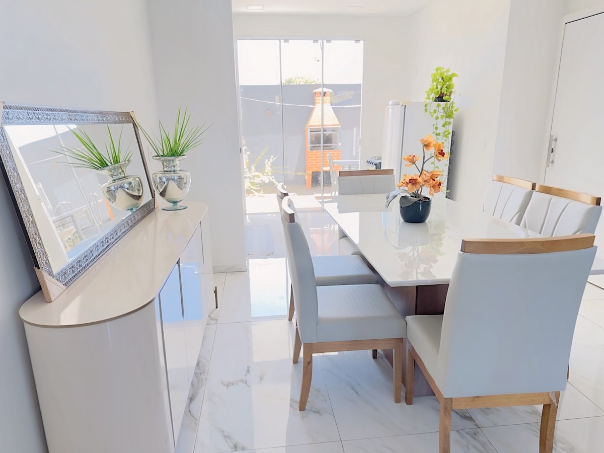 Aconchegante sobrado, com dois quartos (máximo 7 pessoas), dois banheiros completos, sala, cozinha completa e espaço para dois carros. A residência é localizada em um bairro residencial, calmo e tranquilo na região central de Foz do Iguaçu. Acesso ao transporte público a 450m (5min). A casa conta com duas garagens sem cobertura que estará disponível. Você irá dividir o espaço externo da casa com apenas uma pessoa, que ficará feliz em compartilhar informações sobre a cidade.
