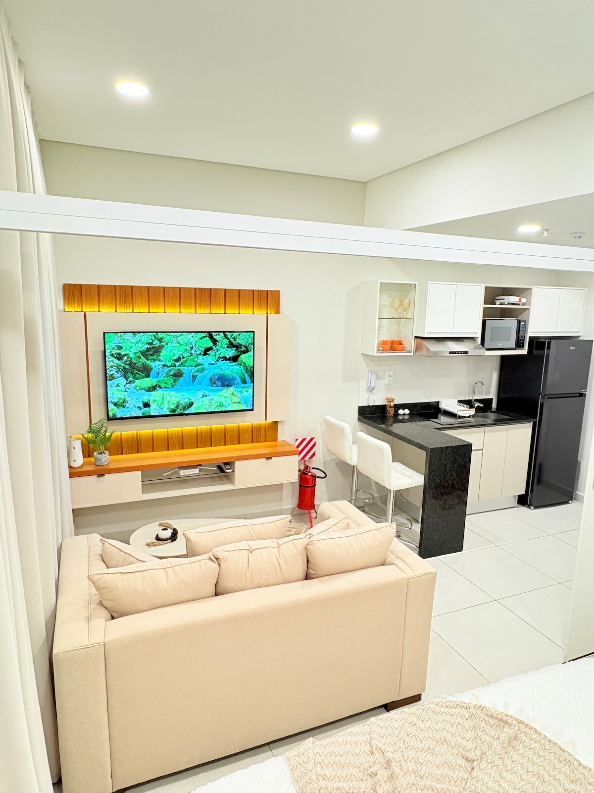 Bienvenidos a una experiencia única en el mejor punto de la ciudad. 🛏️ Dormitorio: Cama de alta calidad, iluminación acogedora y diseño moderno. 🛋️ Sala de estar: Sofá cómodo, Smart TV con acceso a plataformas de streaming y grandes ventanales que llenan el espacio de luz natural. 🍽️ Cocina totalmente equipada para cocinar como en casa. 🛁 Baño completo: Ducha con agua caliente, toallas suaves y artículos esenciales de higiene.