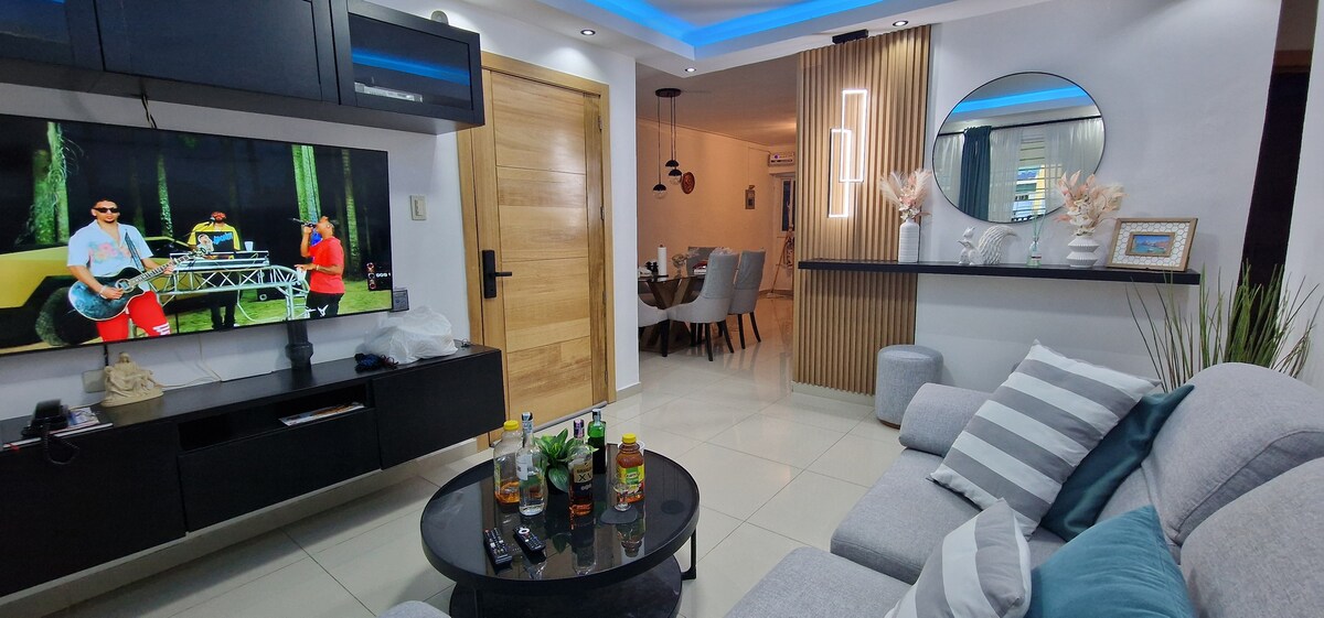 Relax and enjoy. Apartment N2-402. - Palmeras del Este 3. 2 parking spaces in front of the apartment entrance. Netflix in each bedroom and living room. Strategic location: 20 minutes from the beach and the Airport. Everything less than 5 minutes away in Ciudad Juan Bosh with Delivery service: Grocery store, Supermarket, Pizzeria, Fast food restaurants, Drinks, Bakery, toast and empanada bar. Others: Pharmacy, Barber Shops, Salons, Hardware Store.