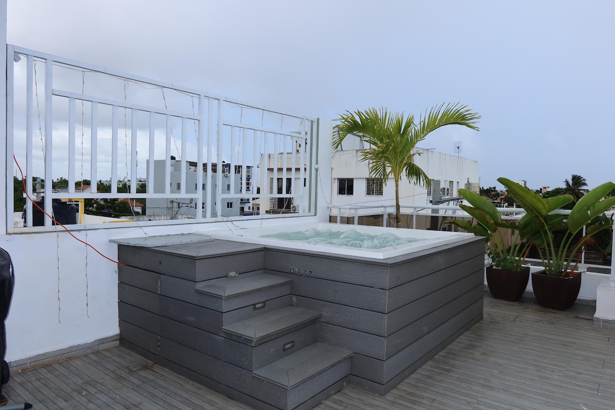 Acogedor, fresco y buena iluminación. Nuestros huéspedes tienen acceso gratuito a nuestra área social en el rooftop. Perfecto para parejas o amigos. Seguridad 24h, portón eléctrico, TV con Netflix, WiFi. A 2 mins. de estaciones de combustibles, a 5 mins del supermercado Bravo, Jumbo, Sirena, Pricesmart , McDonald, Wendy’s, Taco Bell, Pizza Hut, Little Caesars, Burger King, KFC, etc. A 30 mins del Aeropuerto de Las Américas y de la playa Boca Chica.