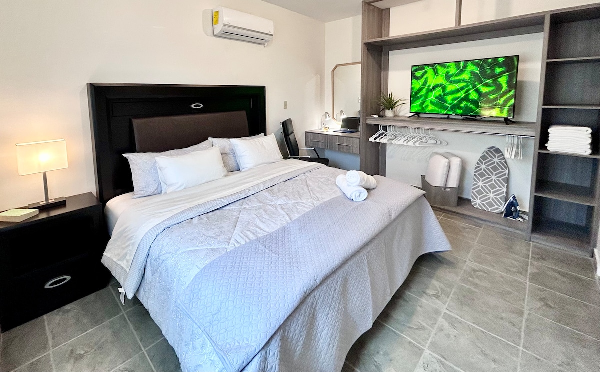 Departamento tipo estudio (sin divisiones), disfruta de nuestro espacio tranquilo y céntrico y de fácil acceso, cercano al Consulado Americano (7 minutos), centro comercial Las Misiones, aeropuerto, central camionera, Parque Central, plazas comerciales y supermercados, bancos, a dos cuadras de Avenida Tecnológico. contamos con plancha, frigobar, microondas, cafetera, licuadora, utensilios básicos de cocina, parrilla, cámaras de vigilancia, escritorio de trabajo, guardarropa, baño amplio.