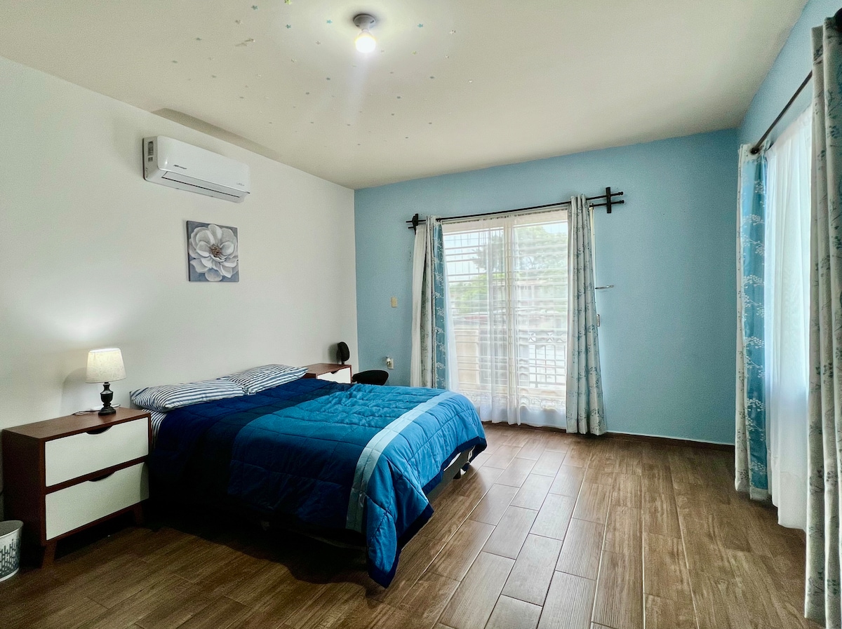 El alojamiento es en planta baja completamente independiente, agradable y fresco, las recámaras son confortables y frescas independientemente de los ventiladores de cielo y climas. la cocina funcional y equipada, área para lavar, cochera con acceso directo a la casa, la cual está rodeada de plantas y jardines completamente bardeada en una zona muy tranquila y segura.