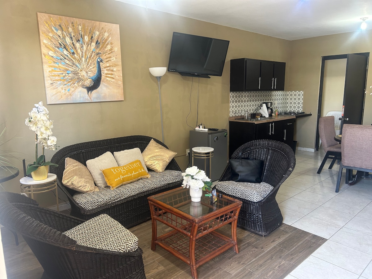 Departamento completo para 2, muy cerca del IEST. Autoentrada con caja de combinación porta llaves, mini-Split, TV Inteligente, WiFi, escritorio, silla de oficina, IZZI, NETFLIX, 2 camas individuales, colchones ortopedic, ropero, secadora de pelo, cafetera, licuadora, tostador, parrilla doble, burrito, placha, cochera, jardín, cocina integral, platos, vasos, tazas, cubiertos, sartenes, comedor, botellón, refrigerador, microondas, baño completo con artículos de limpieza, manguera para la arena!