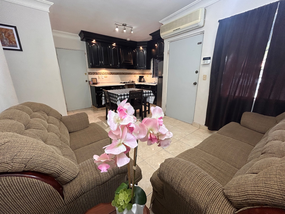 Este departamento es ideal para grupos pequeños, familias o parejas. Al entrar encontraras la cocineta y área de comedor comedor para 4 personas y un pequeño espacio para ver la TV. Hay 2 habitaciones: La primera habitación con una cama matrimonial y suficiente espacio para acomodar tus cosas. En la segunda habitación hay 3 camas individuales dividido con un medio muro para darles mas privacidad. Un baño completo y un pequeño espacio de lavado.