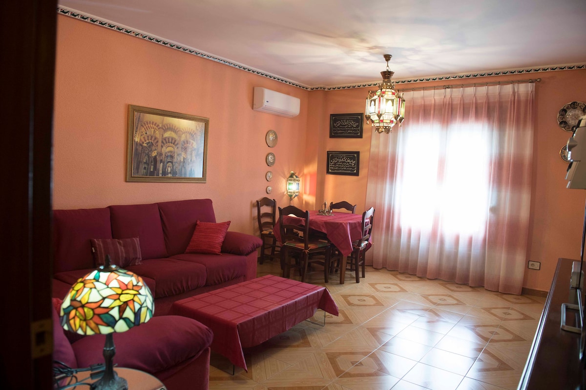 Amplio apartamento de 95m2 muy cerca del centro, Decorado al estilo de diferentes culturas y colores. Luz natural en todas las habitaciones y doble acristalamiento de Climalit. Aire acondicionado frio-calor en todas las dependencias. 2 Cuartos de baño nuevos, con plato ducha y otro con bañera hidromasaje, también un pequeño patio privado estilo andaluz. Garaje privado sin coste. De junio a septiembre se ofrecen pases gratuitos para los huéspedes a la plscina municipal, situada a unos 150mts.