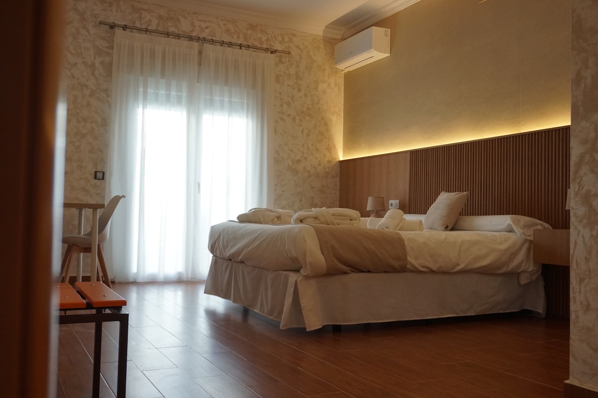 Nuestra habitación Suite es perfecta para un fin de semana romántico. Relájate en la bañera de hidromasaje, observa el mundo girar desde su inmenso ventanal o disfruta de una efervescente copa de champán en su terraza. Con un toque monacal y a la vez chic, su iluminación acogedora y un esmero total en la atención de los detalles, nuestra habitación Suite creará la atmósfera perfecta para vosotros. Equipada con: *smart-TV *frigorífico, microondas, cafetera. *bañera de hidromasaje *terracita