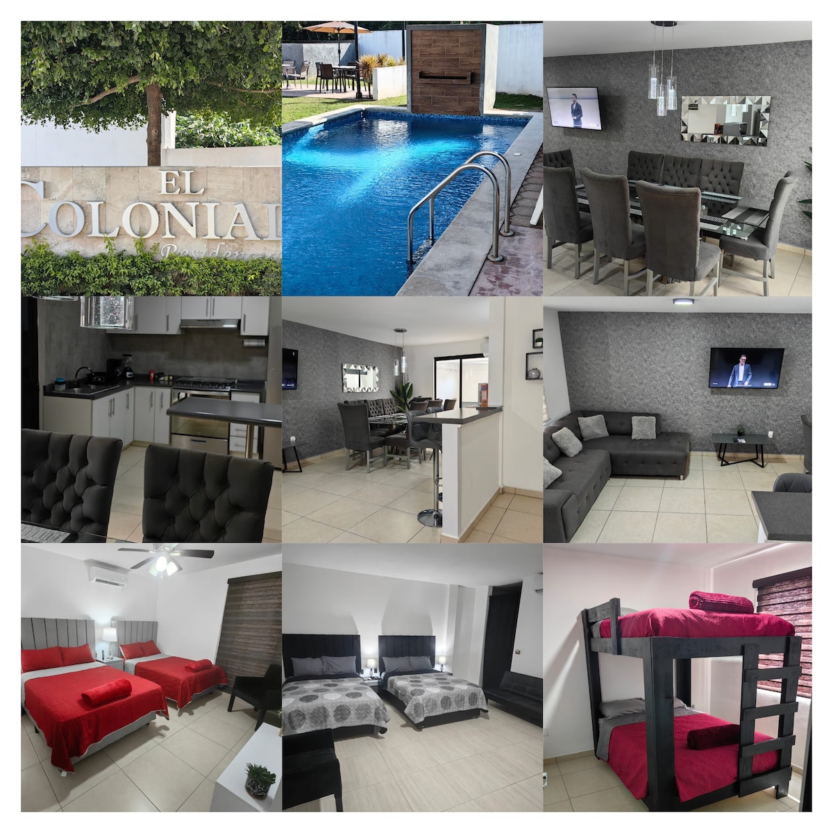 Hermosa casa unifamiliar. Ofrece piscina al aire libre con asador (el agua es a temperatura ambiente), frigobar, sala y mobiliario para exterior. Wifi gratuita. Estacionamiento para 2 autos medianos con portones eléctricos, 4 habitaciones(con baño privado, aire acondicionado y 2 de ellas con TV por cable)sala, comedor y cocina equipada con utensilios básicos, desayunador y 2 medios baños en áreas comunes.