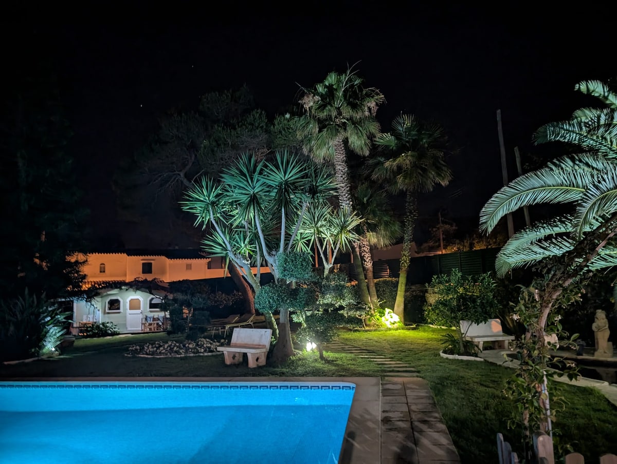 Chalet de 2 habitaciones, reformado en 2023, con piscina (>9m), gran terraza y parking privado. Pequeña perla en una zona muy tranquila, ideal para familias o una/dos parejas deseando descansar disfrutando de la belleza de la isla. Las playas de Cala Blanca y Cala Santandria se encuentran a pocos minutos andando. También podréis encontrar en la zona varios comercios y restaurantes.