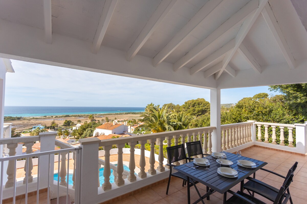 Discover Menurka–Cala Blanca, your coastal paradise in Menorca: a 110 m² semi-detached chalet for 8 guests, just 100 m from the beach; 4 bright bedrooms, 2 bathrooms and a guest toilet, fully equipped kitchen, living room with sea views and Wi‑Fi; private terrace and garden with outdoor furniture; solarium to enjoy sunsets and views of Mallorca on the horizon. Ideal for families and groups. Air conditioning, parking, barbecue, and final cleaning. Satellite TV. Sea views from every room. Welcome!