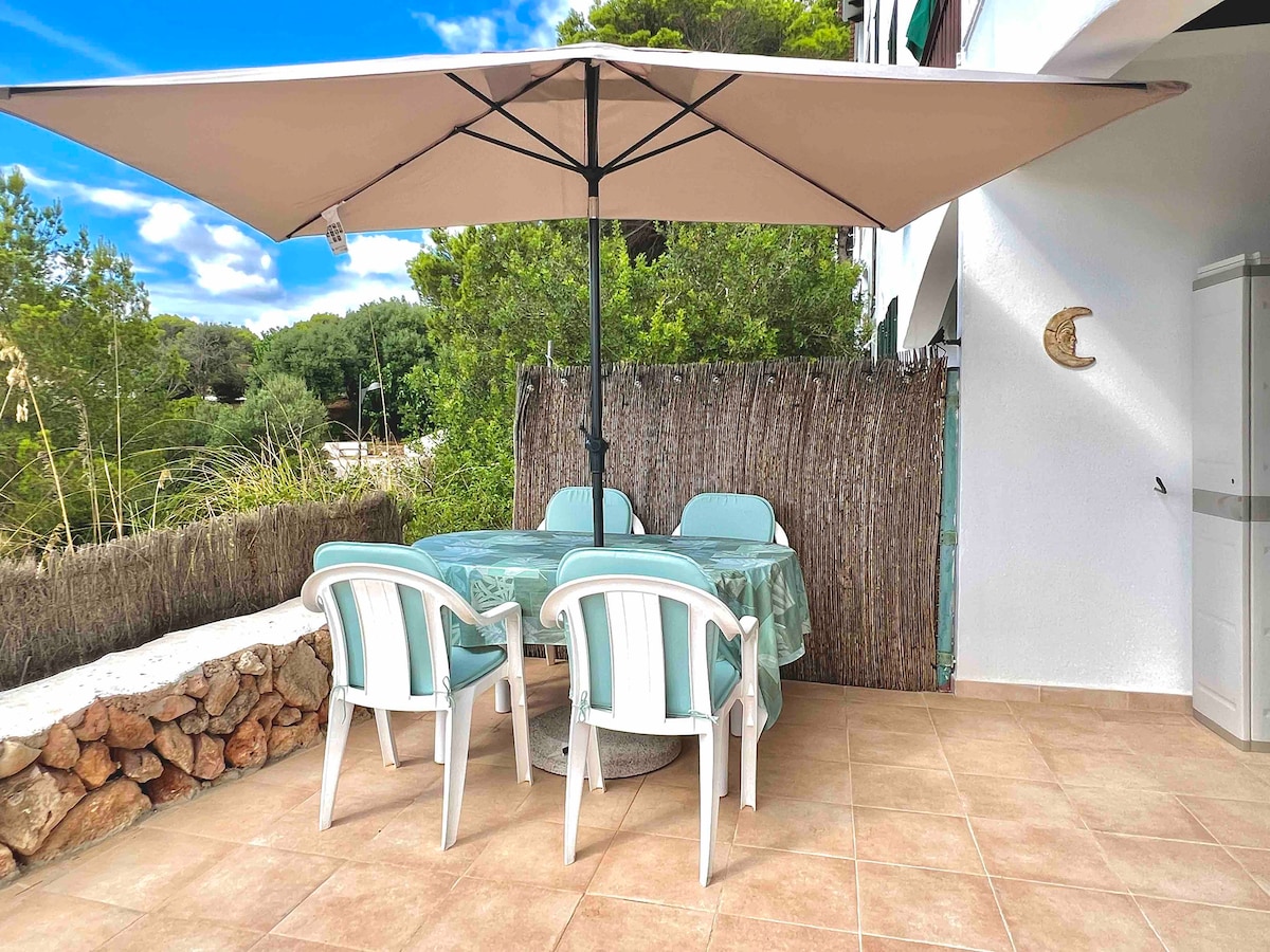 Apartamento duplex con escaleras. Dos dormitorios en total. En el principal una cama de matrimonio y en el otro una cama Quenn .Un baño, y unas escaleras que dan al salón y cocina.Dos terrazas orientadas a un pinar Completamente amueblado y acondicionado, con aire acondicionado y calefacción, piscina grande con jacuzzi, hamacas y sombrillas. Piscina compartida Se encuentra a 5 km de Ciudadela y cerca de las mejores calas de Menorca, el apartamento se encuentra en una situación privilegiada.