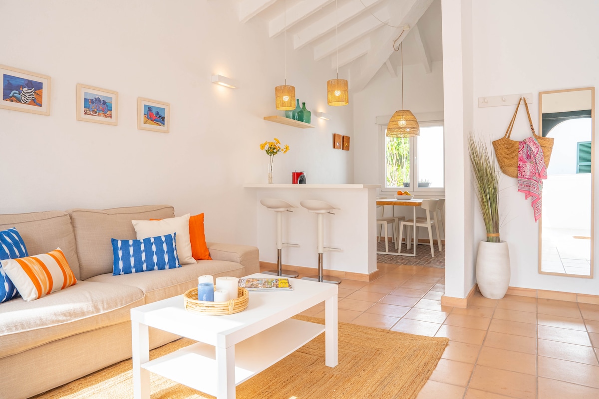 Our typical "casita menorquina" is situated 100m from Cala Blanca, a lovely crystal clear small beach with restaurants and bars. It's located in a very tranquil neighbourhood, inside a small condo with 3 other similar houses sharing a big swimming pool. The house has a big private outdoor area with garden and BBQ facilities and... the best... a rooftop terrace with chill out area and a gorgeous sea/sunset view. The house has 2 rooms with air conditioning.