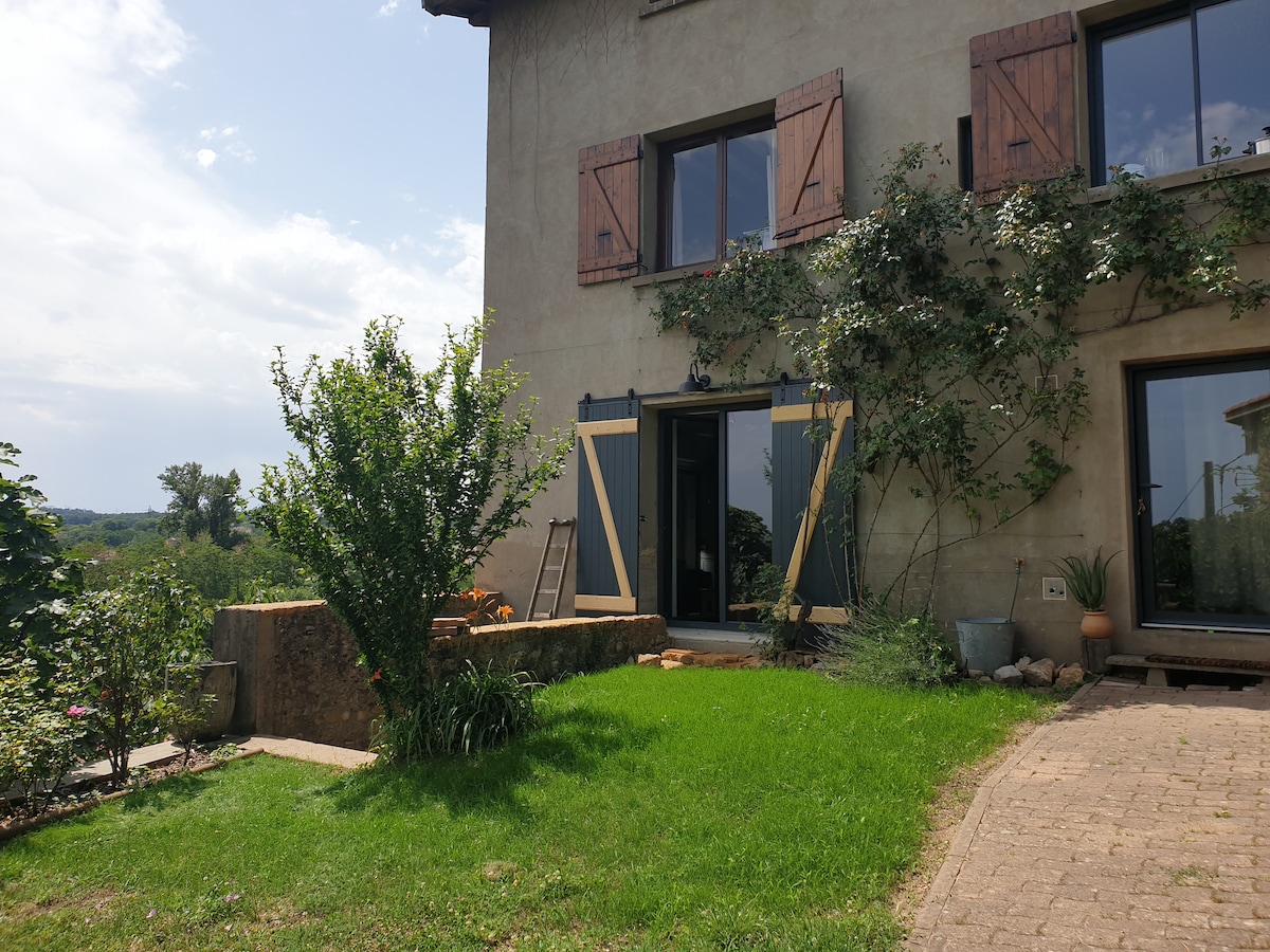 Venez vous ressourcer dans cette maisonnette à l'esprit campagne entièrement restaurée et décorée avec le charme d'antan . Sa situation élevée en fait un lieu paisible et privilégié avec un panorama époustouflant sur toute la vallée . L'accès aux commerces et à la gare peut se faire aisément à pied en 10 minutes .Lyon (La Part Dieu ) est à 20 minutes en train . De merveilleuses randonnées bucoliques sont possible à partir de la maison