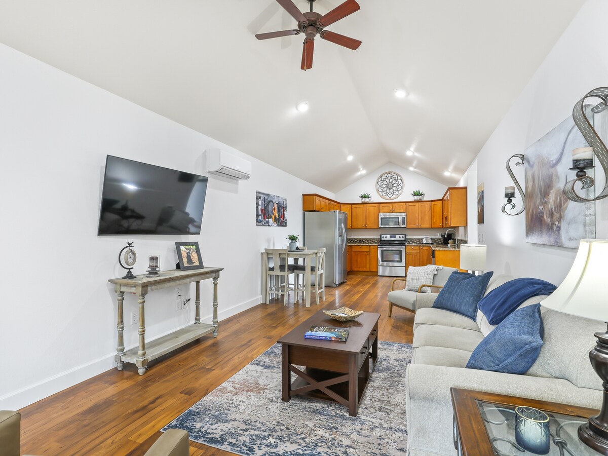 *Cozy studio apartment on ten-acre farm. *One queen-size bed *Complete kitchen w/ range, dishwasher, microwave, refrigerator, toaster, and coffeemaker. *Large bathroom, sleeping area with queen bed, living/dining area, and washer and dryer access. *Wireless internet and wall-mounted 40" Smart TV with Netflix. *Relax on your private veranda, or go for a stroll on our 10 acre property. *Enjoy a picnic in the woods. Creek, pond, bridge, & view to enjoy.