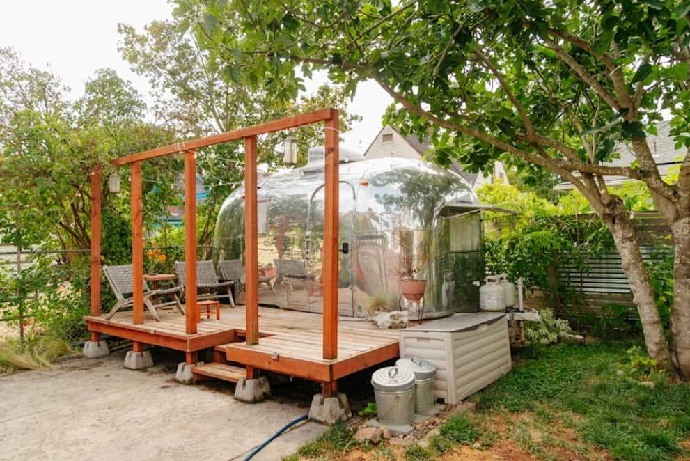 Our tiny home started life as a commuter bus in Manchester, England, in 1953, then did stints in San Francisco and Mt. St. Helens before finding a home as the Grilled Cheese Grill in Portland. Now it’s been reimagined as a mid century modern-inspired tiny home, with whimsical painting details from one of its former lives and fresh new handmade details that make it a cozy, inspiring stay. Find more on IG @smore.life