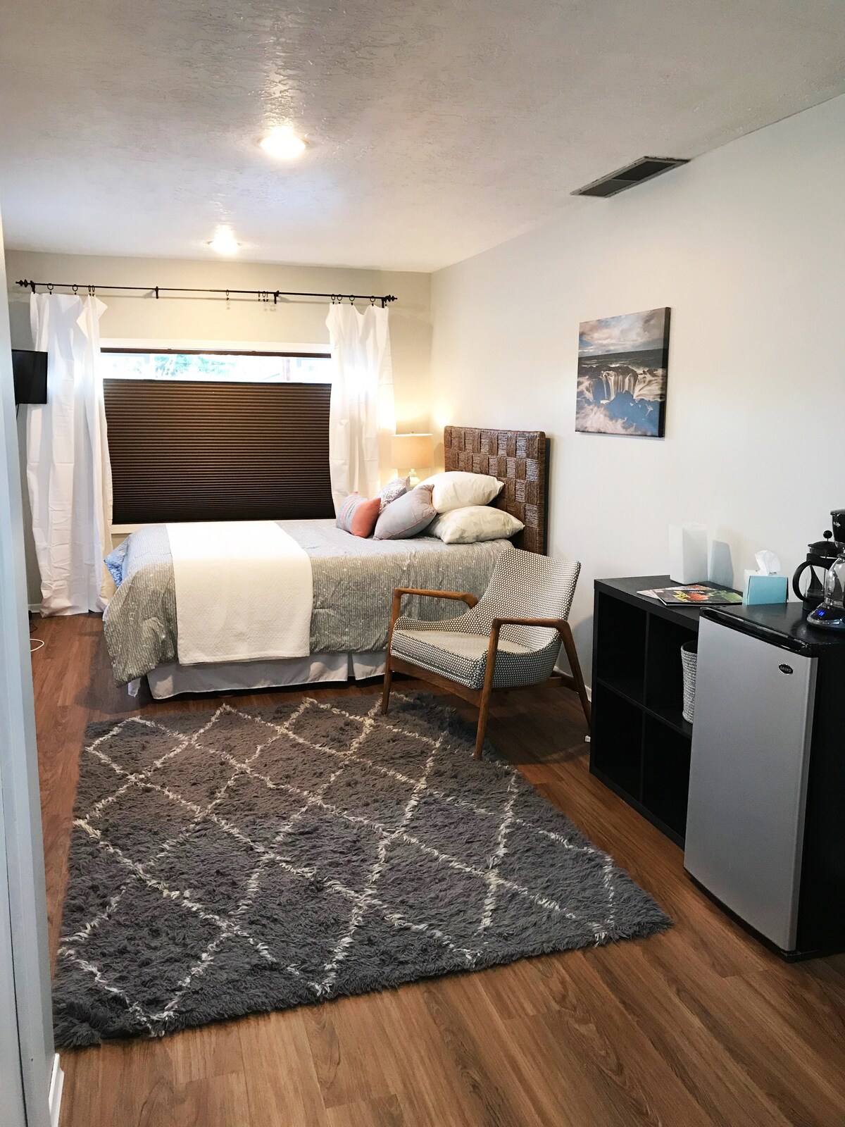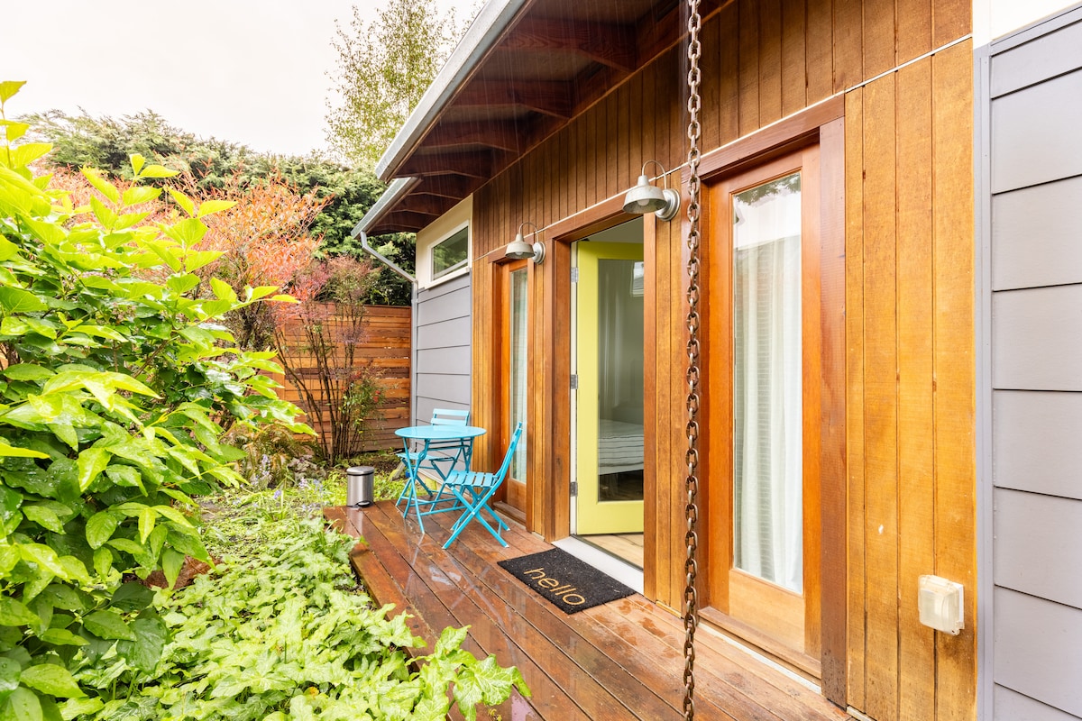 Detached, very small (300 sq ft) guest house in the Southeast Portland neighborhood of Woodstock. Lots of walkable eateries as well as New Seasons and Safeway within a 5 minute walk. Close to Reed College, Woodstock Village, Springwater Trail, Southeast Portland Neighborhoods, Public Transportation. You’ll love the location, the outdoors space, and the ambiance. Good for couples, solo adventurers, and business travelers. TV (Netflix enabled!), A/C (summer months), heat, coffee, fridge/freezer.