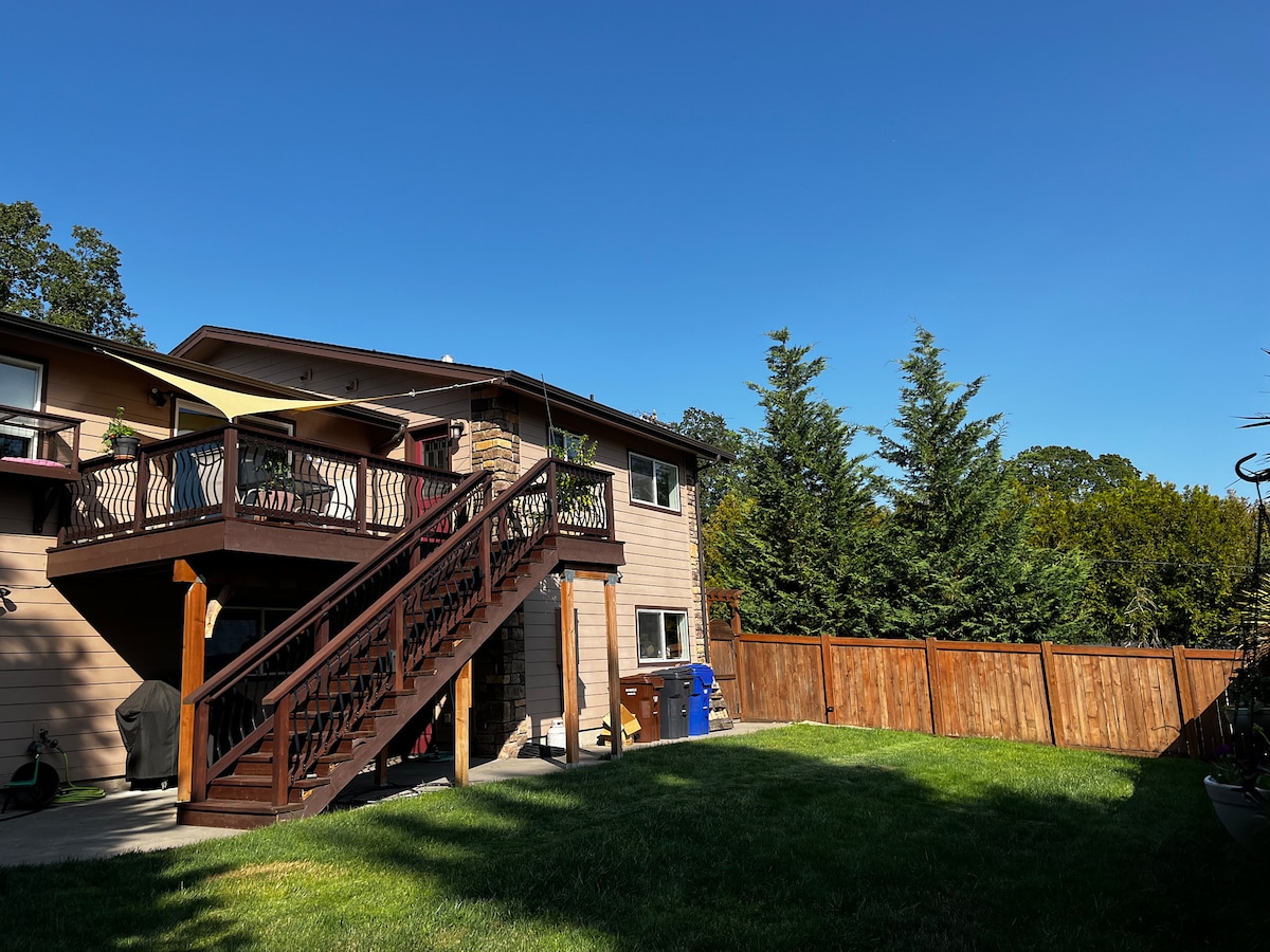 Guests tell us they love the view! They also mention this downstairs apartment is very clean, spacious, comfortable and relaxing, with great wifi too! • 750 square feet of privacy, including a large private deck • Full kitchen, queen size bed and fast wifi • Leather furniture, large screen TV with HDMI capability (streaming only) • Private staircase leads to your garage entrance. No shared spaces. Garage entry. Level 2 EV charger Clackamas County License #108