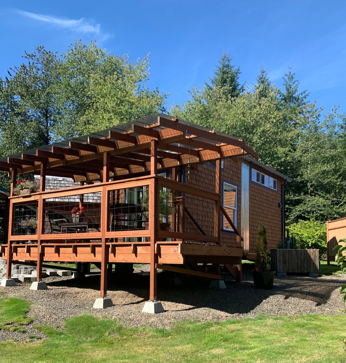 Stay atop the deer park foothills in this brand new tiny house boasting views of the Juan De Fuca straits with completely forested surroundings. With 1 bedroom, 1 bath and a living room that can be transformed into a queen sleeping arrangement, the Evergreen Incline hosts up to four. Enjoy your morning coffee on the front deck or in the 2 person hot tub. Thoughtfully decorated to bring the experience of nature inside, you’ll enjoy natural fiber 100% cotton sheets and cotton linen bedding.