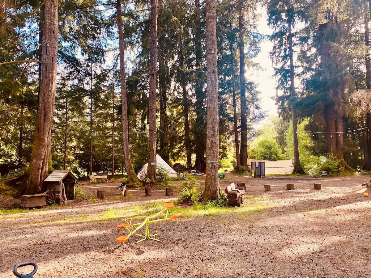 Escape the noise and hustle of the city and trade it out for a relaxing stay at our cozy tent. Here you can barbeque up dinner, relax by the fire, sit on the porch and enjoy your favorite movie on the projector. Then you can fall asleep listening to the sounds of nature with a crackling fire to keep you warm. You may wake up to the sound of a rooster crowing as you steep a fresh cup of coffee before you head out on your adventure exploring all the Olympic Peninsula has to offer.