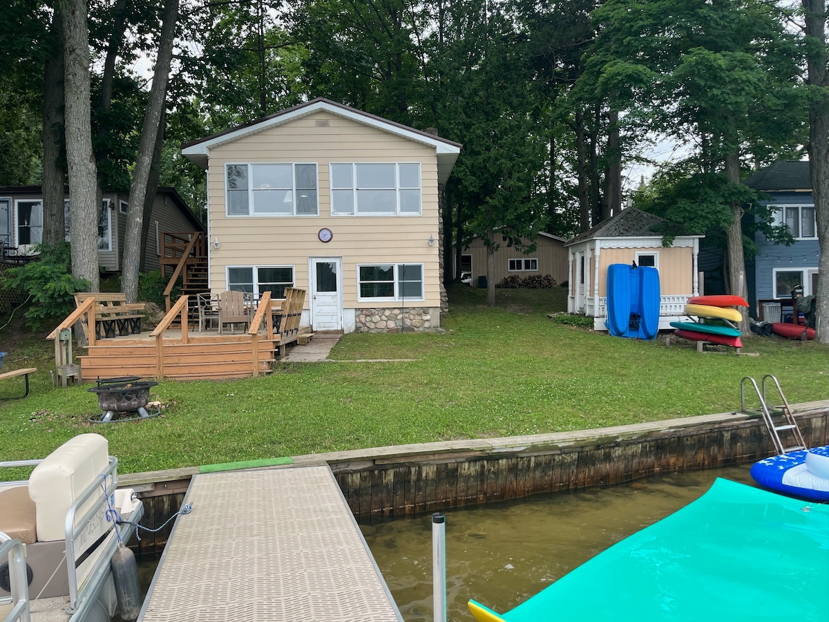 Pure Michigan experience starts with a tiny Paradise Lakefront Cottage plus extra bonus! The Love Shack! Huge beach private !crystal clear water!! Swimming sunbathing floating on the lake! Outsidefire pits on a beach the stars are gorgeous at night next to the gazebo with double bed!! outdoor tiki bar!! front porch with a picnic table! BBQ Grill got a big dock 3 feet by 30 bring your own boat jet ski the lake connect 5 different lakes it comes with free 4 kayaks! cruise around the Lakes!
