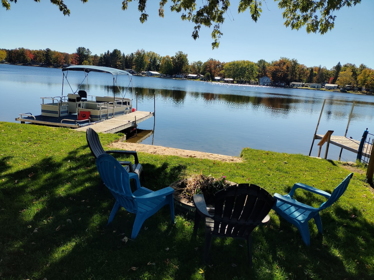 Pure Michigan experience starts with a tiny Paradise Lakefront Cottage plus extra bonus! The Love Shack! Huge beach private !crystal clear water!! Swimming sunbathing floating on the lake! Outsidefire pits on a beach the stars are gorgeous at night next to the gazebo with double bed!! outdoor tiki bar!! front porch with a picnic table! BBQ Grill got a big dock 3 feet by 30 bring your own boat jet ski the lake connect 5 different lakes it comes with free 4 kayaks! cruise around the Lakes!