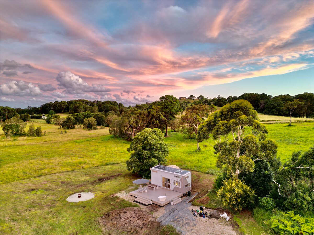 A tiny luxurious space to relax, rejuvenate and re wild. Immersed within nature, uninterrupted views offer seclusion, allowing you to truly unwind. This modern, split level, solar powered tiny home, offers a luxurious and cosy space with two queen sized beds fitted with soft linen, a warm shower, composting toilet, self contained kitchen and a breakfast bar. Outside, take advantage of an extra large dining deck, fire pit and outdoor bath in which you can soak under star covered skies. Enjoy!