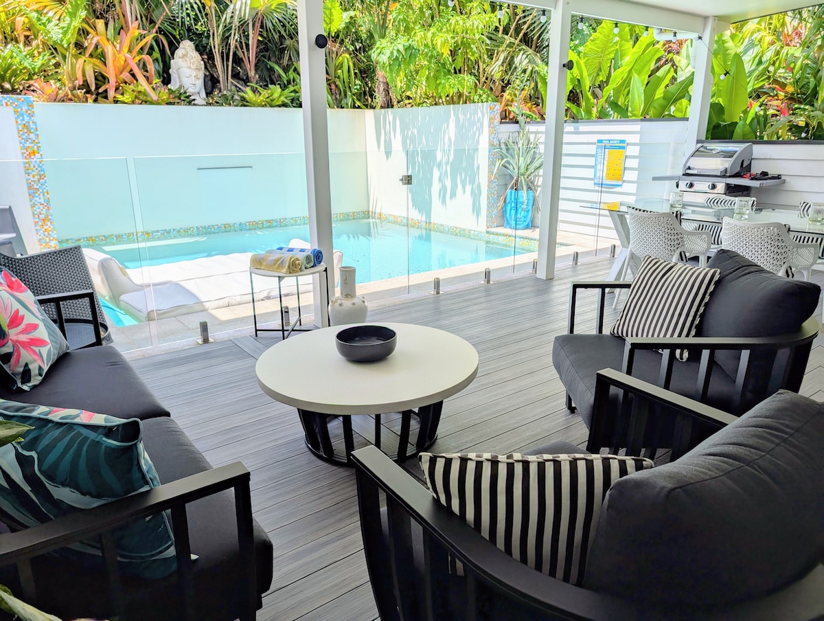 The Lazy Llama Evans Head is a seaside cottage. The perfect combination of location and style surrounded by lush tropical gardens and the sound of the ocean. The Lazy Llama is the idyllic getaway for couples, families or a group of friends. Hide your car keys away with cafes, shops and white sandy beaches all steps from your deck. Soak up the sun lazing around the pool, take in the sea breeze rocking in the hanging chair and enjoy the balmy evenings by the fire pit.