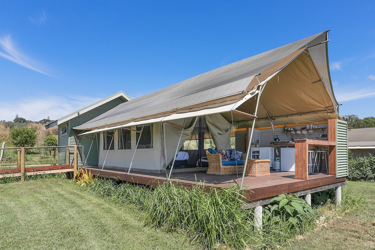 Stay in one of 5 Off Grid Glamping Tents on a family run cattle farm only 5 minutes on a sealed no through road from Byron Bay. Each of the Tents are designed and screen planted to give privacy. All have views to the Byron Bay lighthouse. See below: https://www.airbnb.com.au/rooms/32389534?s=51 - with bath and rainforest views. https://www.airbnb.com.au/rooms/32407218?s=51 https://www.airbnb.com.au/rooms/32372970?s=51 https://www.airbnb.com.au/rooms/32406846?s=51