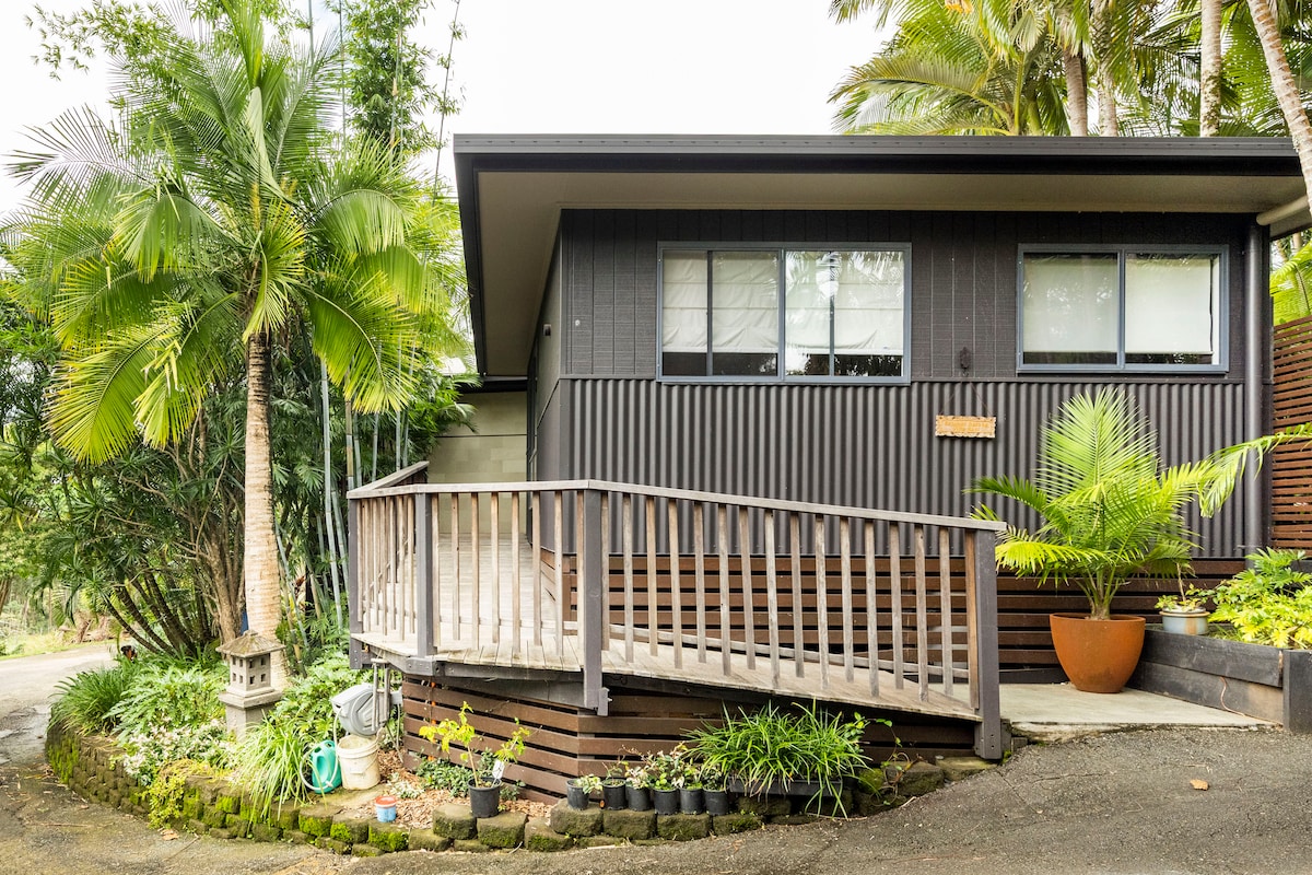 Enjoy the lovely setting of this romantic spot with nature in a special Tiny Home. It is an idealic, tranquil escape for a couple. This unique style accomodation is situated on a 75 acre macadamia farm next to Maguires Creek overlooking a beautiful Lagoon. Located in the Byron Bay Hinterland, Teven is 15 minutes to Bangalow, 12 minutes to the beaches of Lennox Head and 30 minutes to Byron Bay.