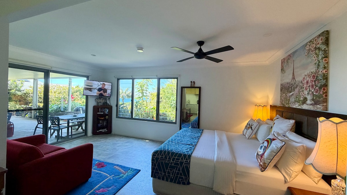 Luxury studio in a tropical garden,30 metres to beach front, designer bathroom with bath and rain shower, washing machine. A fully equipped kitchen, 1 queen size bed, fan, underfloor heating, outdoor deck with sea views and under cover private gazebo with lounge seating and electric barbecue /grill ,and all weather blinds. Your well behaved dog is welcome with its own bed and leashed between house and dog friendly beach at end of the garden..we are surrounded with wildlife that is protected .